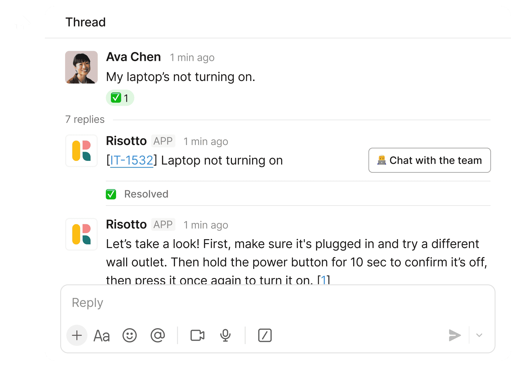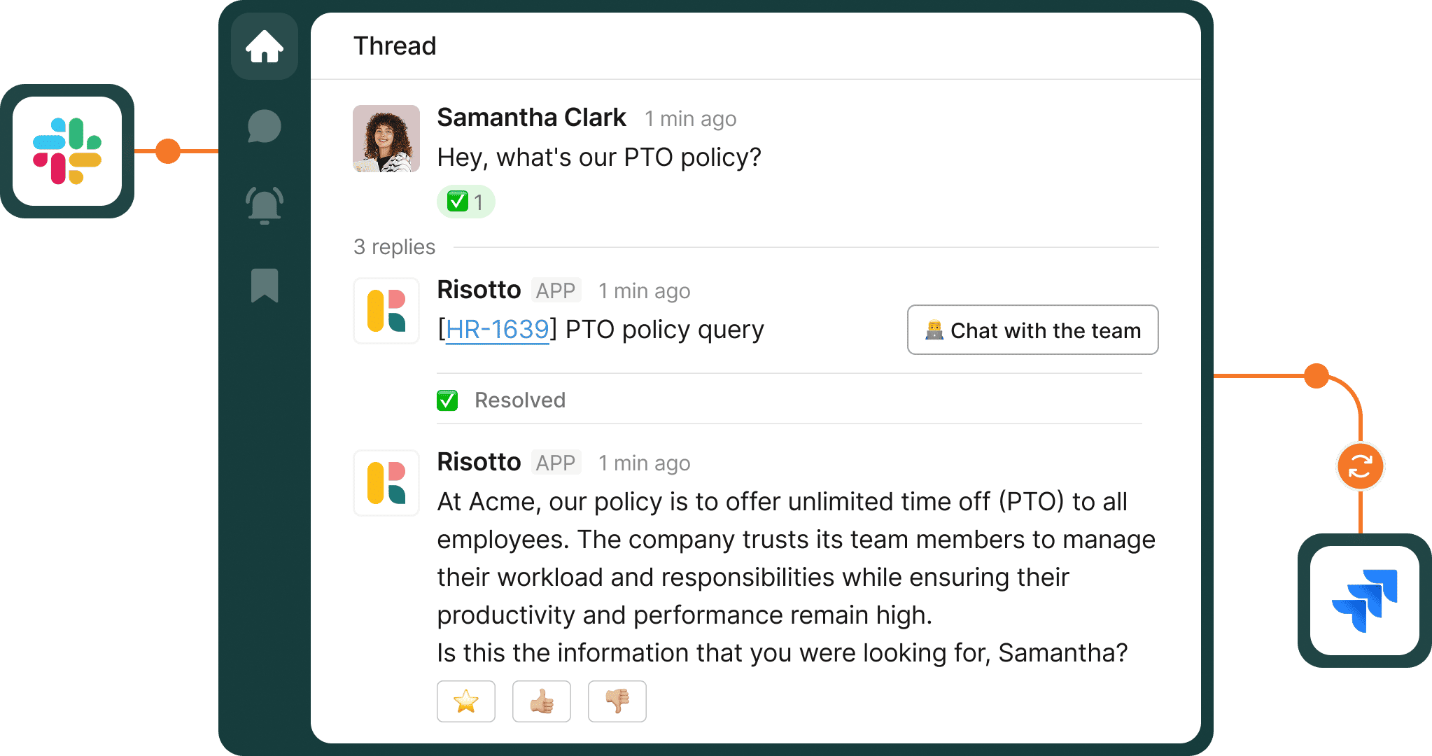 Most AI bots hit a wall when employees have clarifying questions or need follow-up help. Risotto keeps the conversation going till it’s solved.