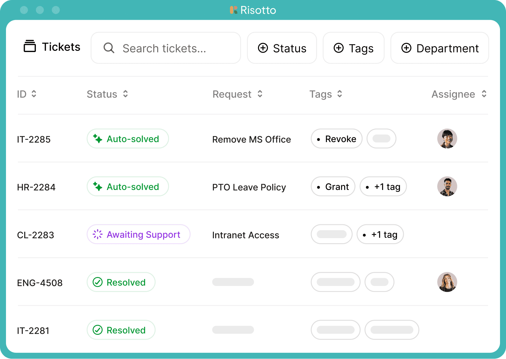 Risotto’s AI goes beyond FAQs. It captures context, resolves requests end-to-end, and only escalates requests that absolutely need IT intervention.