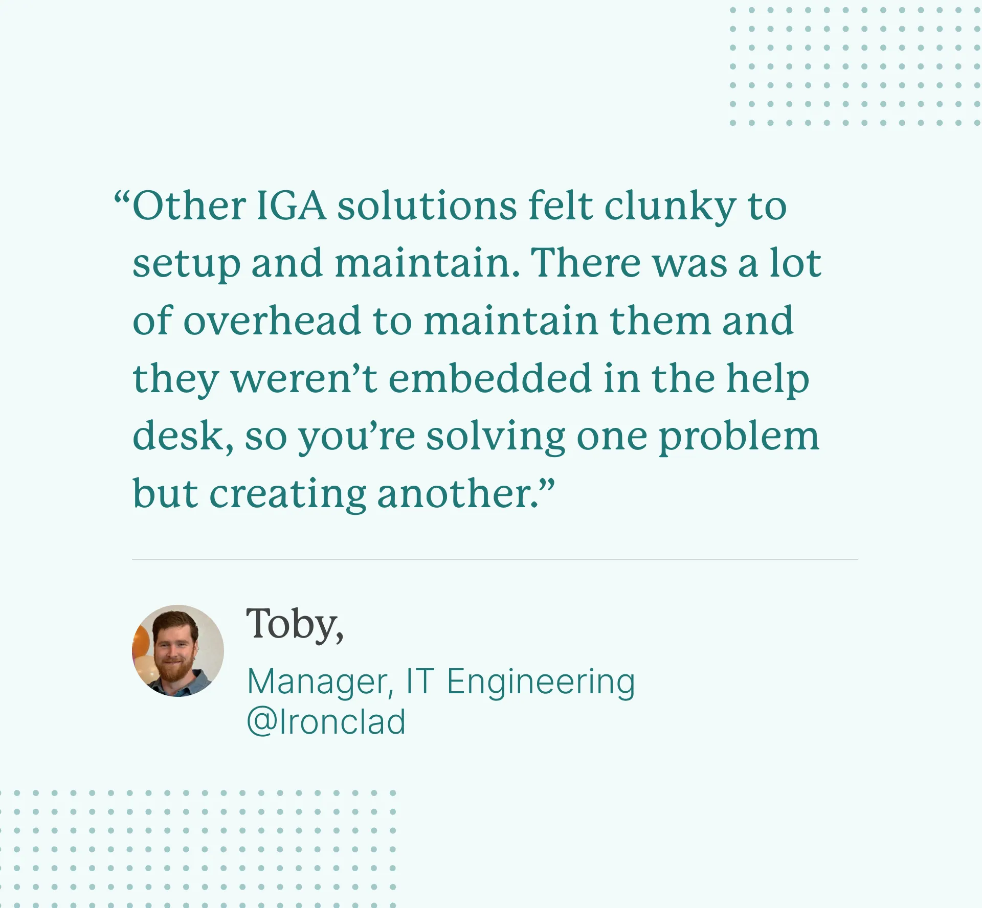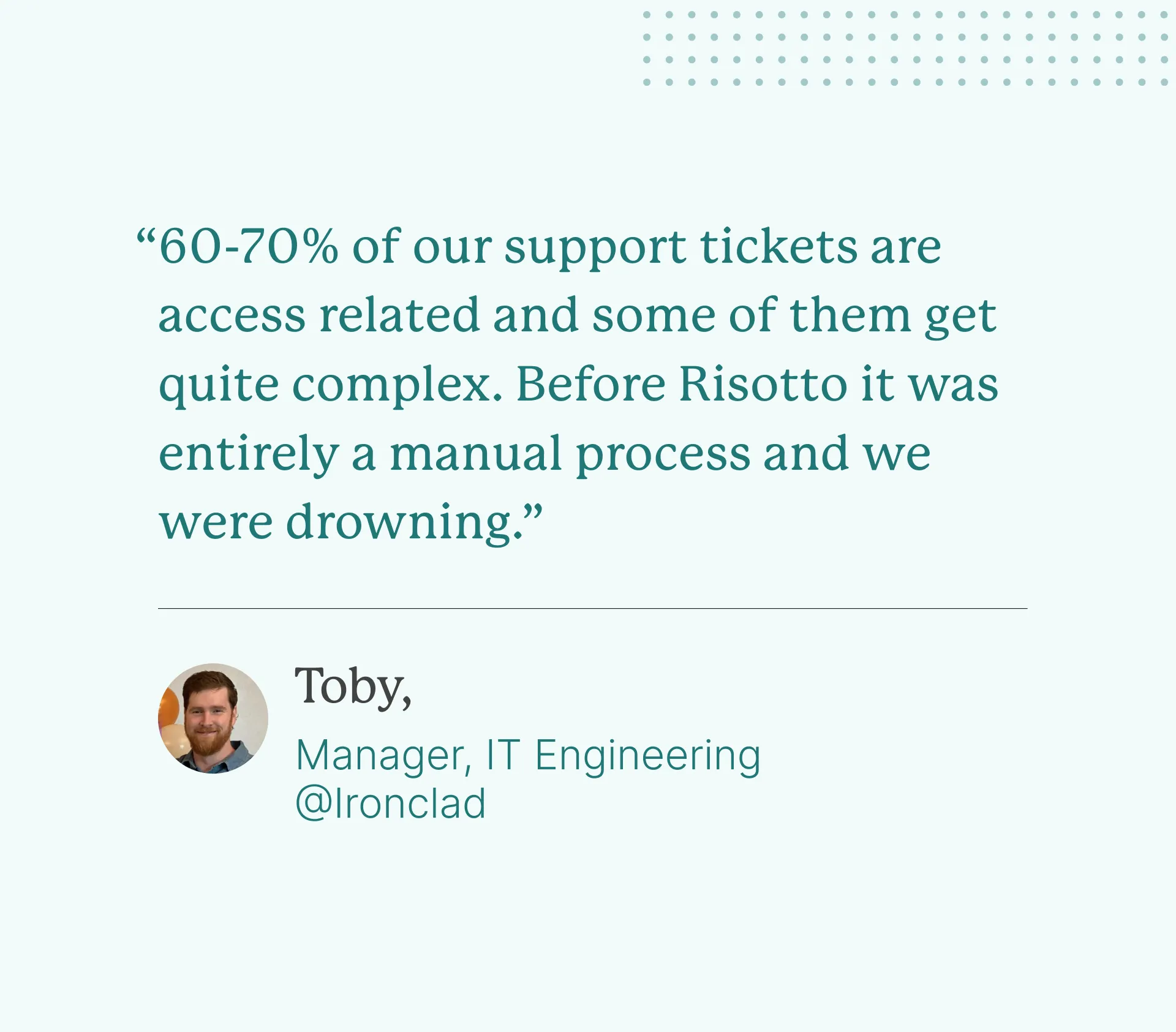 Behind the ticket volume lay a deeper operational challenge. Ironclad’s access management relied on manual spreadsheet tracking of applications, approvers, and system groups. “Managing access requests manually is never a good idea because it’s error prone, inconsistent, and your time-to- resolution suffers,” Toby reflects. The process was particularly vulnerable during coverage gaps, when team members unfamiliar with specific workflows would rush through requests, inevitably missing critical details.