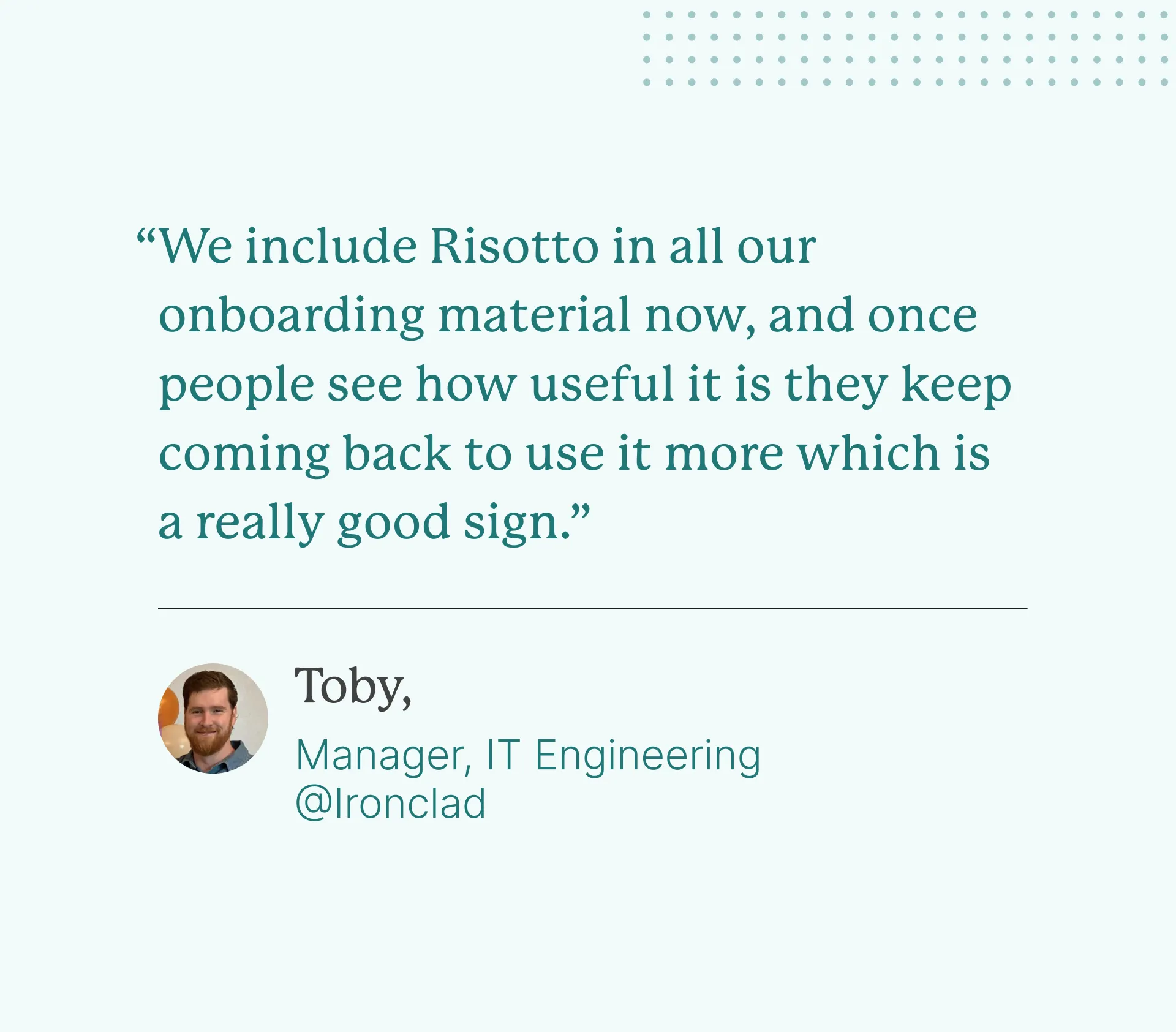 "Risotto had the most thorough onboarding experience I've ever been a part of. Alex was great - he met with us weekly and made it very easy to quickly get up and running."