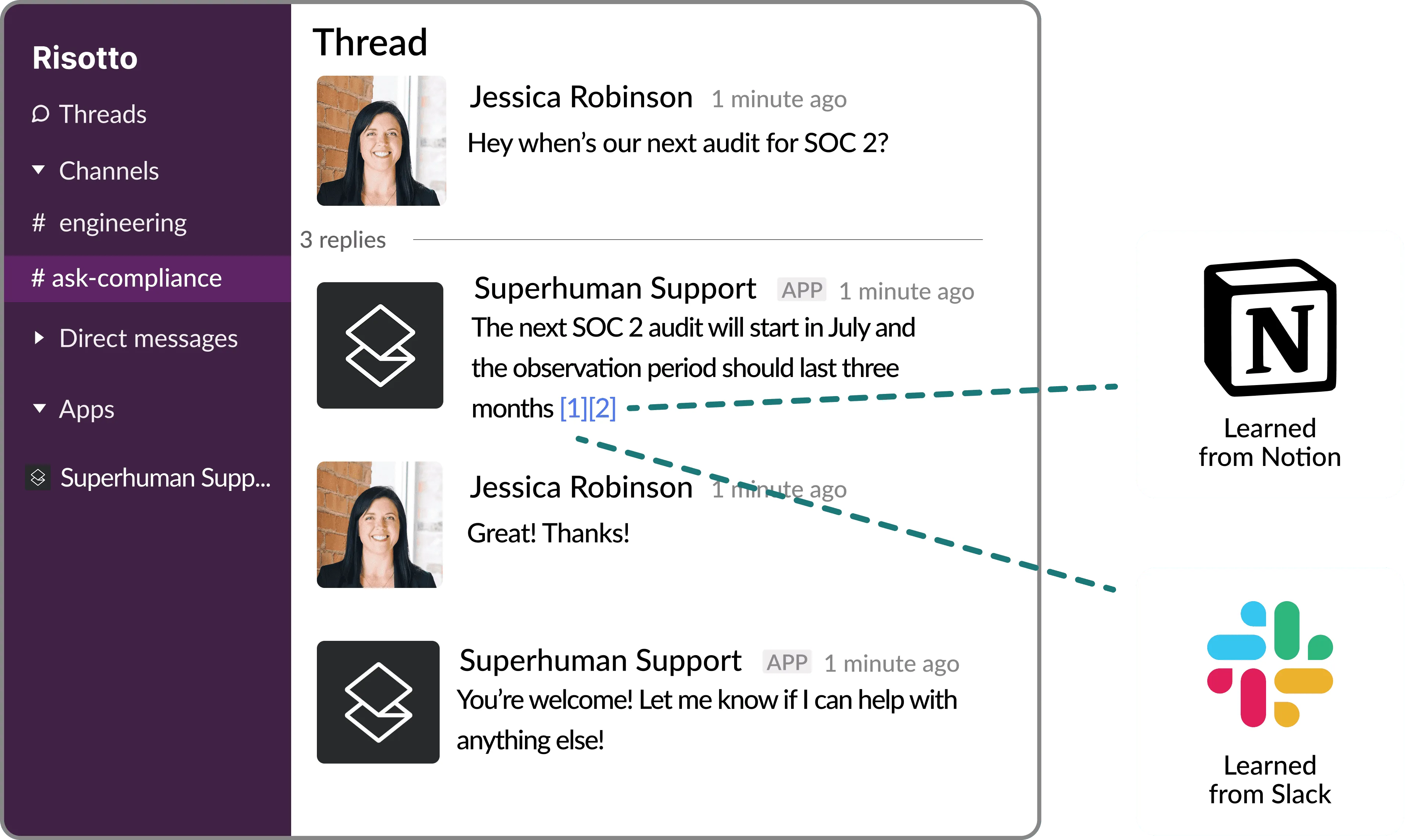 What started as an IT solution has expanded to support multiple teams across the organization. Currently, Risotto handles requests for IT, compliance, finance, and HR/people operations at Superhuman. “The multi-department capabilities are awesome. Our engineering and RevOps teams now also want to use Risotto as they also get lots of the same questions over and over again,” Collin shares.