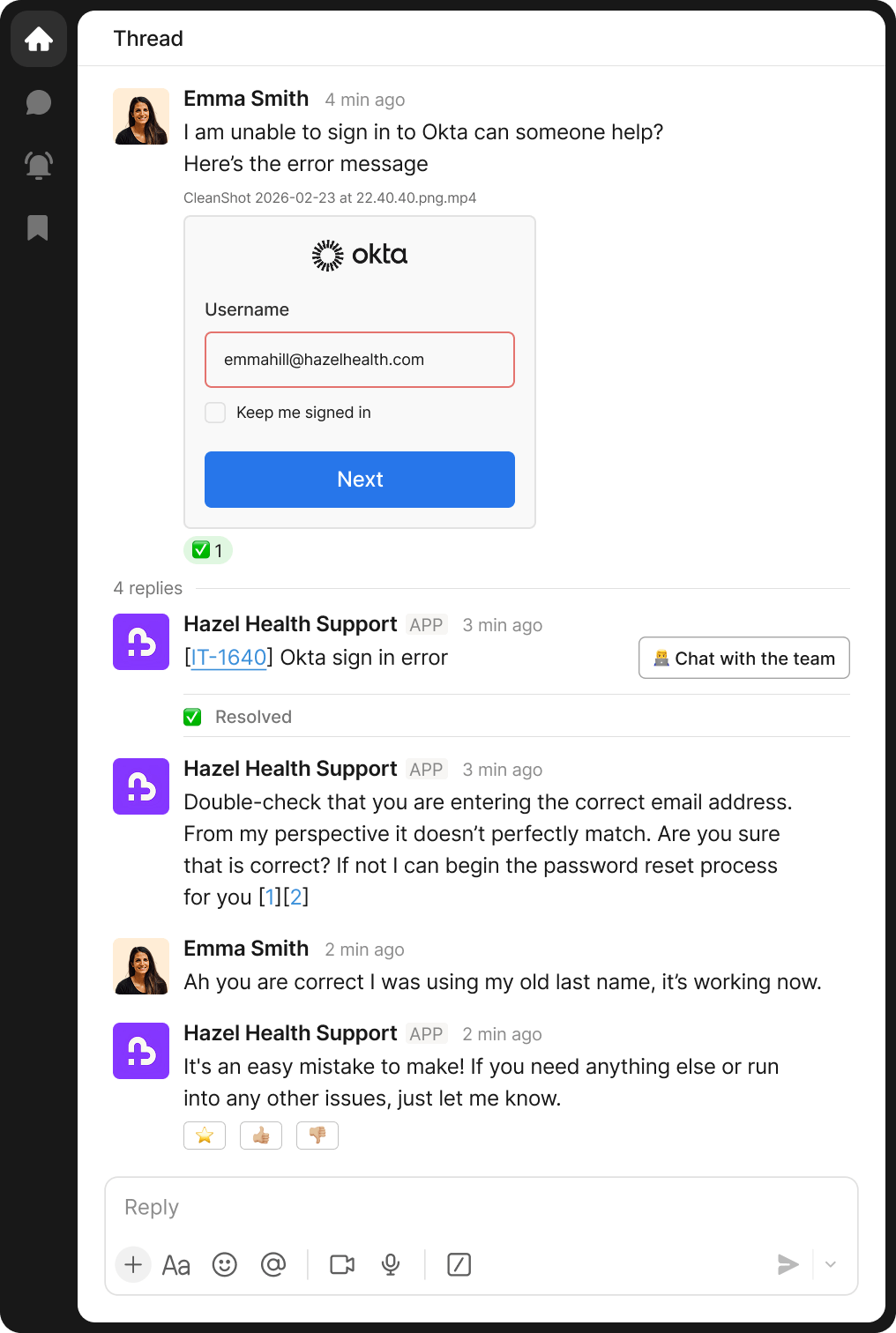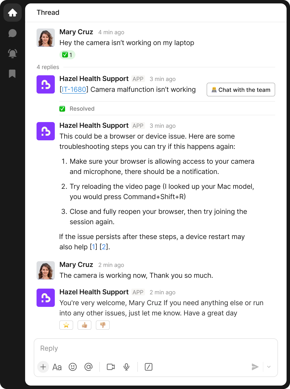 Today, Hazel Health has comprehensive support where teams already work. When an employee needs an account verification key or a clinician has a question about a software update, Risotto responds immediately, unifying scattered ticketing processes into a single support function.