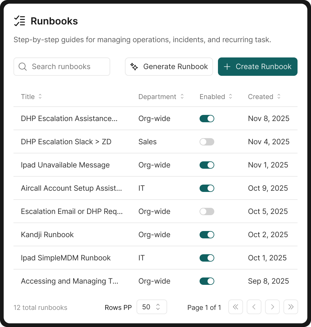 With Hazel Health’s documentation connected, onboarding new departments is seamless. By configuring agent settings in plain English, acquired teams and HR build runbooks with minimal IT involvement.