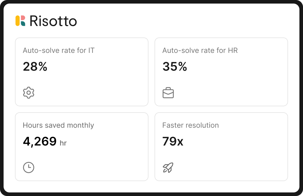 If a request needs human attention, Risotto routes it to the right department, keeping sensitive HR matters and patient information visible only to authorized teams. And because Risotto keeps a real-time log of ticket volume, resolution times, and escalation patterns, Victoria spots recurring issues and adjusts workflows accordingly.