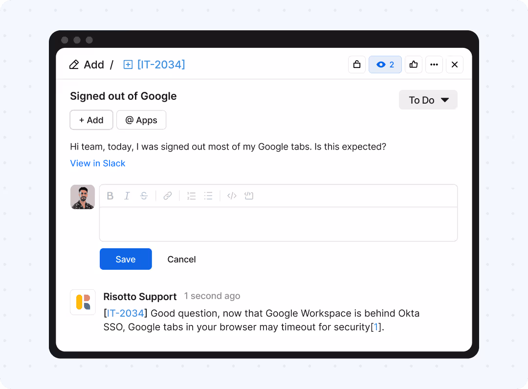 A 3-way sync between the chat client, your ticketing portal, and Risotto ensures your requests look the same across all tools.