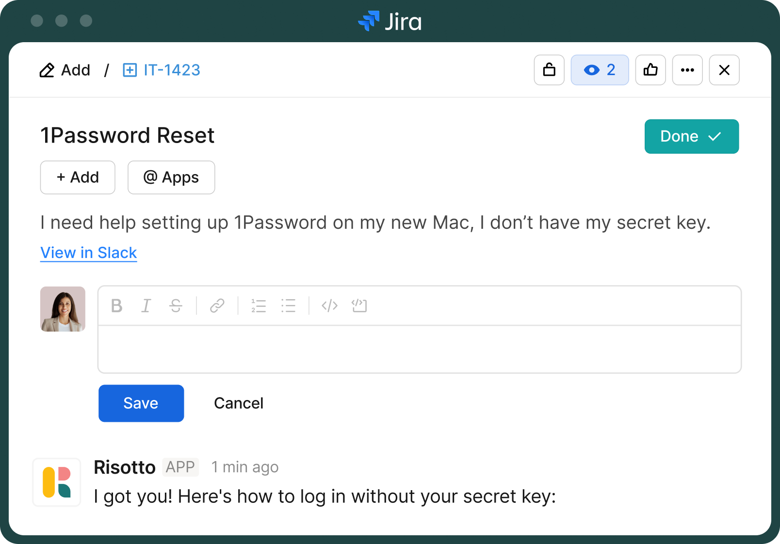 Employees interact with Risotto in Slack or Teams, while every request, update, and resolution is automatically synced with your existing ticketing platform like Jira behind the scenes. Your existing workflows, reporting, and ticket history all stay intact.